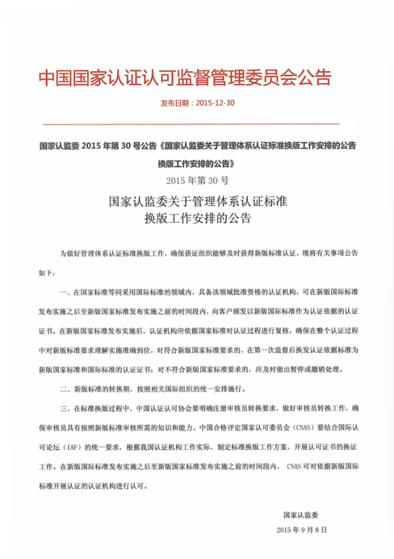 國家認監(jiān)委2015年第30號公告《國家認監(jiān)委關(guān)于管理體系認證標準換版工作安排的公告換版工作安排的公告》